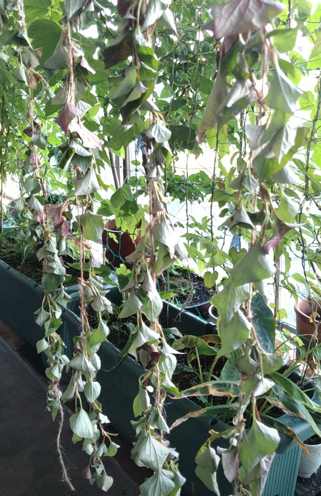 ・後ろの「緑のカーテン」で見にくいですが、縦にぶら下がっている紐4本がドクダミです。