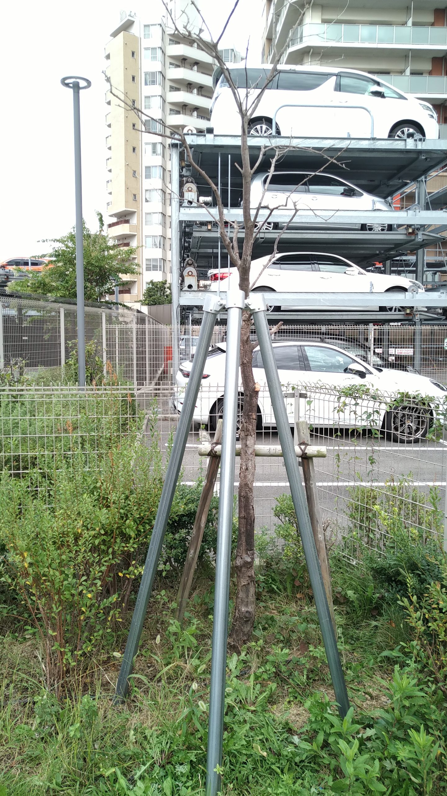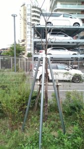 昨日午後、近くのホームセンターで鉄パイプを調達し、今日昼過ぎに注文していた部品が届きました。なにげにウチの建物の周辺を物色したところ、敷地内にある児童公園に3本(オリーブ2本&合歓の木)立ち枯れている植木がありましたので、1本(オリーブ)に試運転の素材になって貰いました。