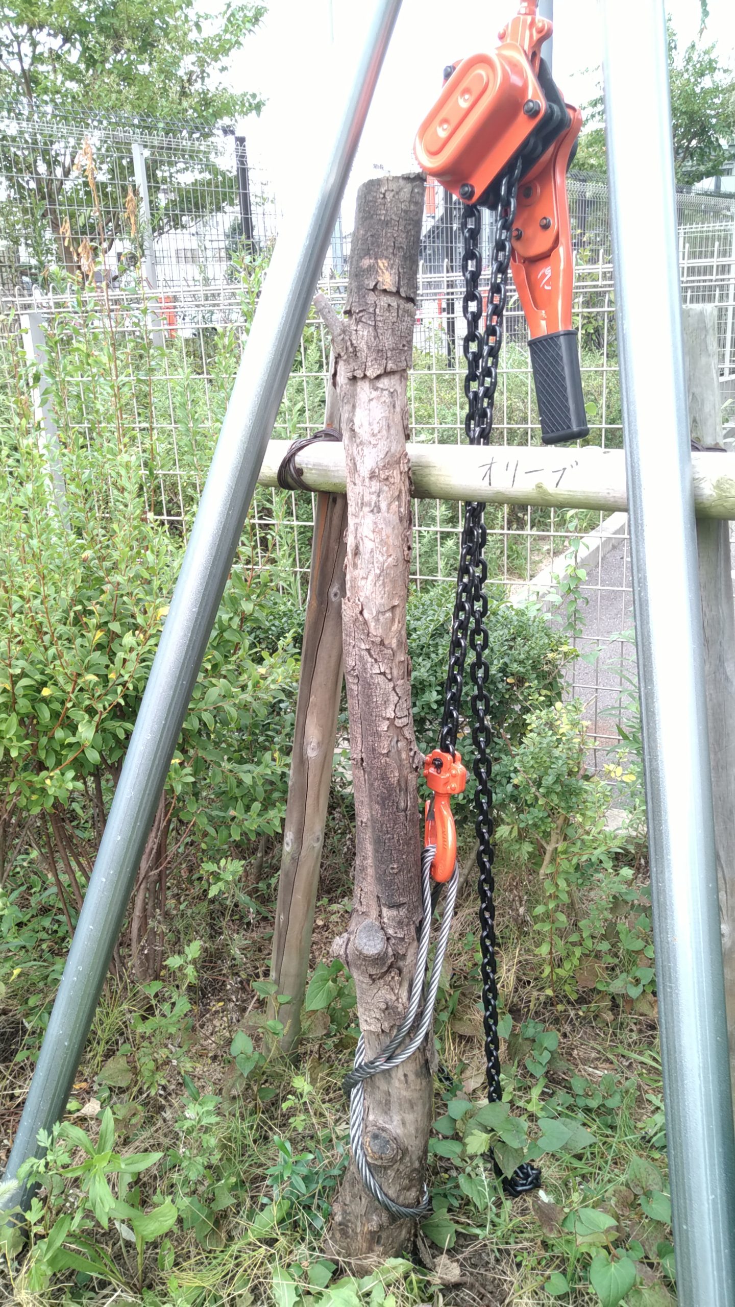 ▼写真3:支柱をセットし、ワイヤーを幹に巻いて、ホイストに連結。これで準備完了です。