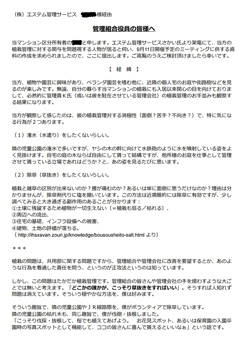 謝罪ゼロ&役員たちの理解を求め、当方の要望を述べ、管理人Kの罷免をほんのり勧告。