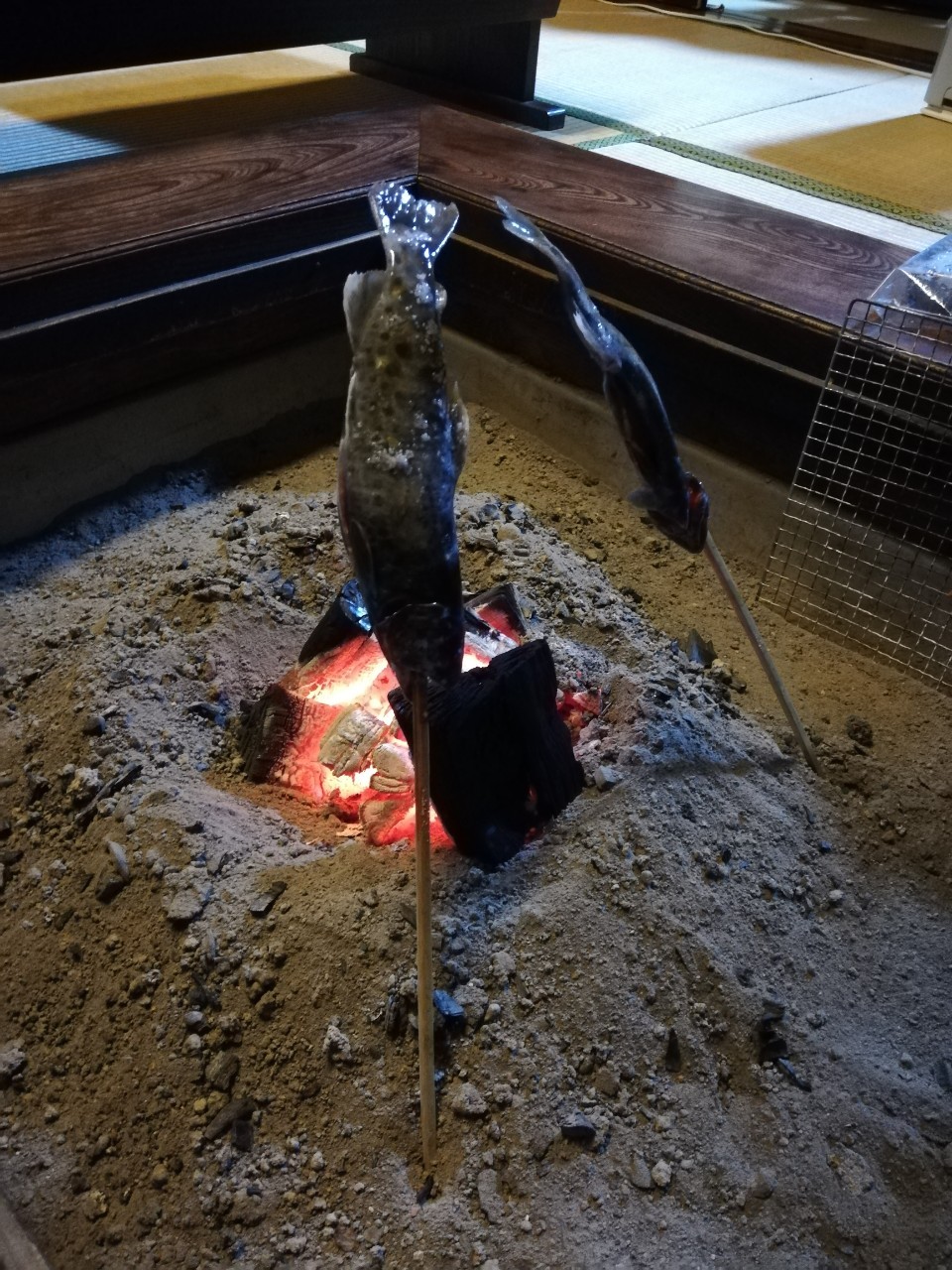 メインの客室には囲炉裏があり、そこで串刺しの岩魚を焼いてくれました。
